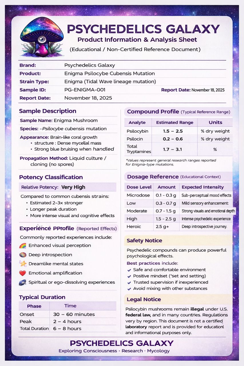 Enigma mushrooms represent one of the most unique and potent developments in modern mycology. Their rare structure, high potency, and deeply introspective effects have made them a subject of fascination among researchers and psychedelic communities alike.